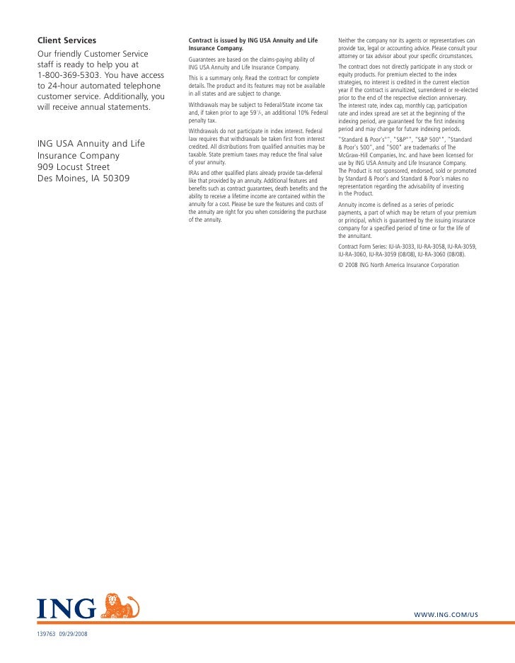 2 ing life insurance and annuity company and risk reduction. Separate account b of ing usa annuity and life insurance company deferred combination variable and fixed annuity prospectus ing goldenselect esii april 29 2011 this prospectus describes ing goldenselect esii a group and individual deferred combination variable annuity contract the contract offered for sale by ing usa annuity and. Corporate site of ing a global financial institution of dutch origin providing news investor relations and general information about the company.